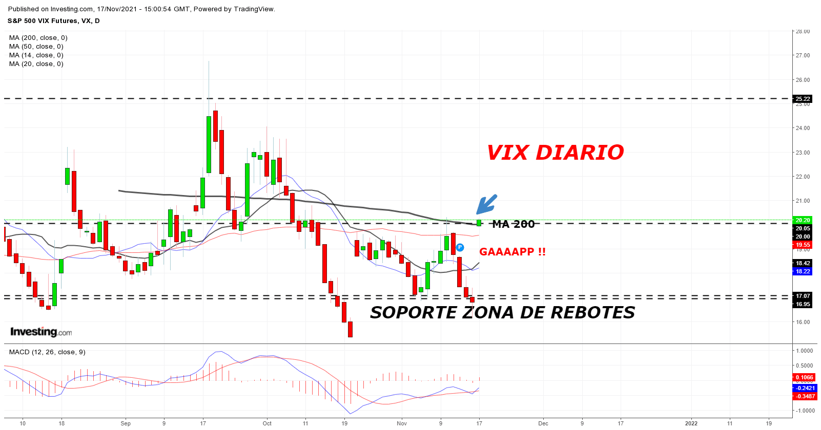 Futuros VIX siguen alcistas por encima de 20 % y rompiendo ( sin consolidar Resistencia MA 200).