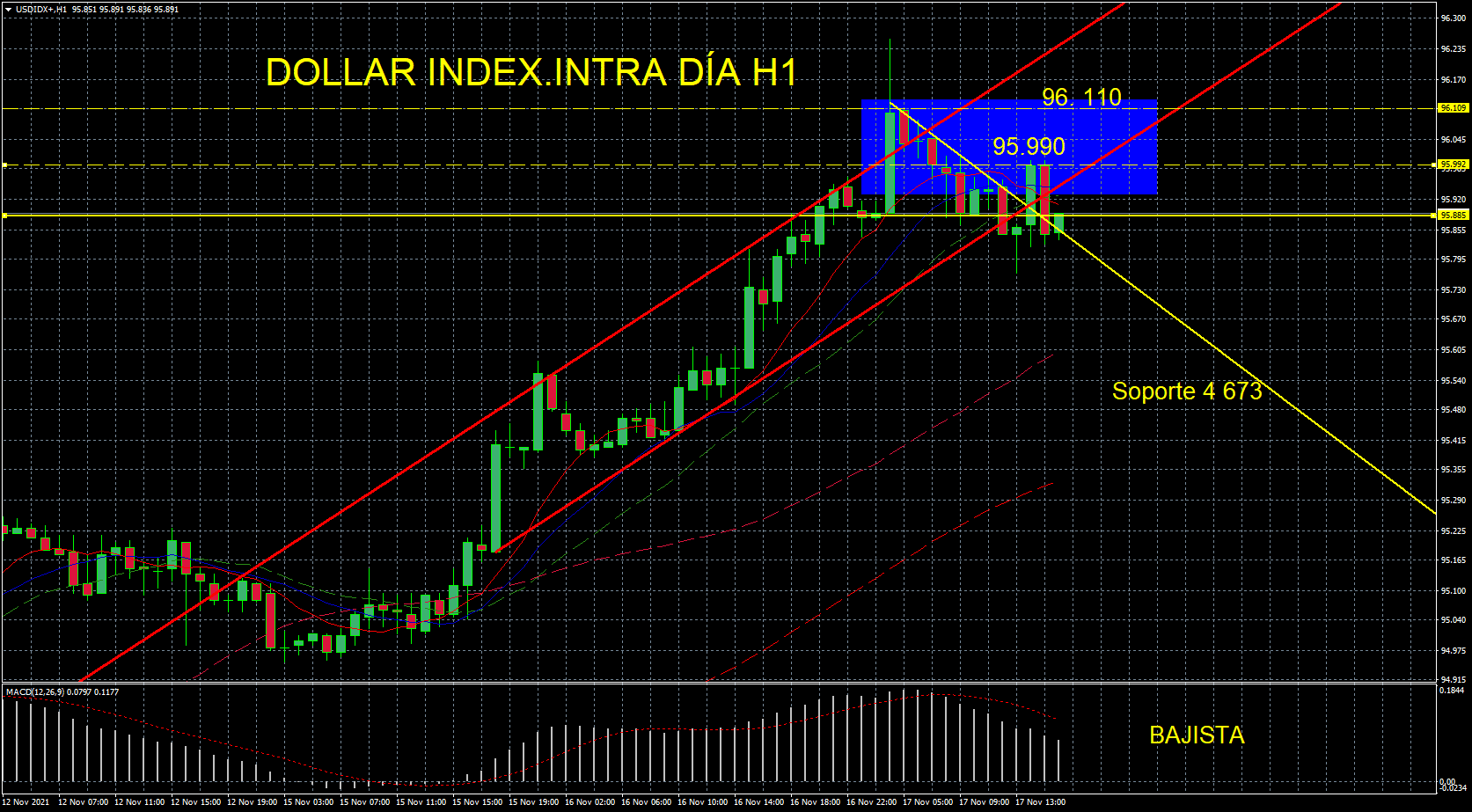 El triángulo de H1 nos dice que no podemos descartar un nuevo repunte alcista del USD tras el recorte durante la mañana y la apertura de sesión en N.Y. Por ello, muy atentos a las posiciones largas en oro. Si este triángulo del Dólar, rompiese alcista retomando el canal alcista, lo normal es que el Oro retroceda ( hoy gana + 1%) o encuentre resistencia.
