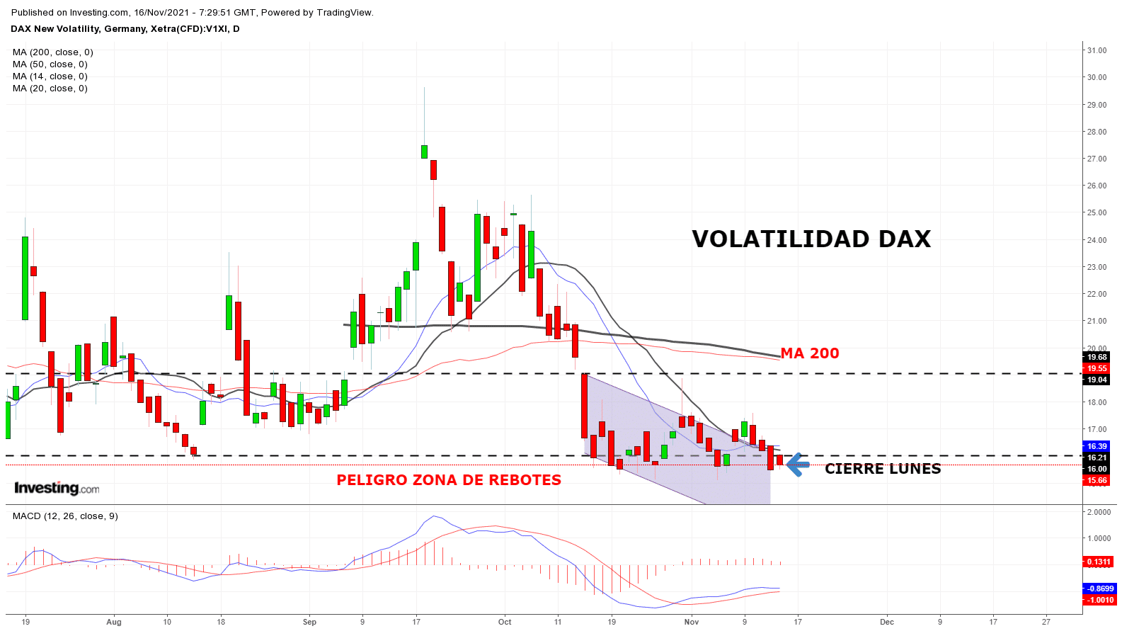 Si es así, vemos a DAX alcista en Apertura con soporte en máximos y Volatilidad bajista y dispuesta a volver al canal bajista según el cierre de ayer lunes.