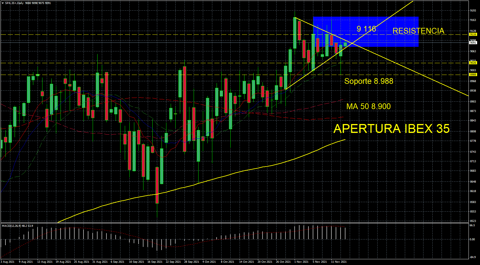 EL IBEX 35 sigue en la zona de congestión decidiendo por dónde romper el cono. Hoy parece que se decide alcista en la Pre Apertura ( abre 9.00 h) Resistencia en 9.116 zona de rechazos habituales. Si hay subida, primer objetivo máximos pasados por encima de 9.200 y por debajo de 9.300 que, teniendo en cuenta como está el IBEX, sería un objetivo magnífico si lograse consolidarlo.