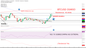 En contra, desde el punto de vista del precio, el BTC se enfrenta a un cruce de MA’s alcista – el mencionado antes – que podría retrasarse o no producirse si la sobrecompra anunciada por el RSI escala desde el nivel actual 70 ( inicio de sobrecompra) hacia el 80 niveles de sobrecompra extrema en los que el mercado suele darse la vuelta y recoger beneficios. En ese caso lo importante es el soporte de 38.000 $ que mantendría al activo dentro del soporte de la directriz alcista.
