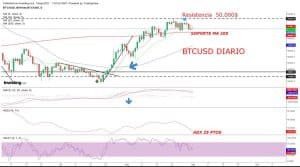 Sigue desvaneciéndose la tendencia de Bitcoin tal y como muestra la caída continua del ADX. También MACD muestra caída contenida por el momento pero, el cruce bajista de MA’S a punto de implicar a la MA de 20 Sesiones – antiguo soporte – indica que el precio se encamina a testar el soporte mayor de MA 200 Sesiones.