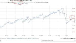 Los datos de la cadena de blockchain del BTC nos muestra desde hace dos sesiones subidas y bajadas de la tasa de hash y sesgo alcista mantenido de la tasa de dificultad. El patrón más alcista para esta métrica siempre ha sido el cruce alcista de ambas que se interpretaba como expectativas favorables en la rentabilidad de los mineros. Una recuperación de la tasa de hash -como vaticinan algunos analistas – y un cruce en lo alto puede devolver el momentum al precio y salvar – quién sabe si rebotar – en el Soporte mayor de MA 200 Sesiones.