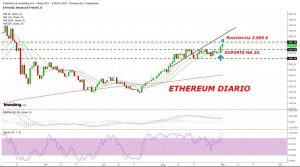 En el caso de Ethereum tenemos una ruptura de lateral clara y transparente cuya proyección nos lleva a 3.600 $. Podemos observar, al contrario de lo que sucede en el Bitcoin, como en ETH el cruce de MA’s es claramente alcista ( la MA 20 es la que lidera el alza de precios ) y también el MACD inicia cruce alcista.