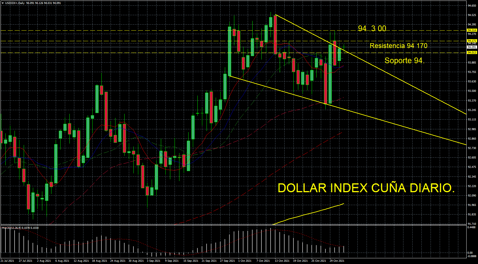 El Dollar index aparece con una cuña bajista de resolución alcista en Diario. Una vez más claro soporte en 94 y recorrido a 94 170 y máximos en 94.300. Estas referencias son básicas para el trading con EURUSD para todo aquel que quiera aplicar la estrategia de correlación inversa entre el billete verde y el Euro. No obstante hoy, máxima prudencia durante la mañana europea y en especial a partir del mediodía cuando el pre market se ponga en marcha (Apertura contado N.Y. 14.0o h).