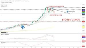 Cuando ahora, esta situación tiene lugar en bajadas, estas se acentúan. La clave será cuando se teste el soporte de 32.000$ ( base del triángulo). Si el testeo llega con hash a la baja, podemos tener rupturas del soporte y crisis para la trend alcista. Esto, desde el punto de vista chartista, constituiría una falsa ruptura del triángulo. ( Pueden repasarse triángulos de commodities como el Oro en charts Diario y Semana).