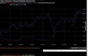 La pérdida de soporte viene provocada por el cruce bajista de MA’s 9/14/20 y la correlación bajista de tasa de hash ( – 8% últimas 24 horas ) con la tasa de rentabilidad minera que podemos ver en el siguiente gráfico.