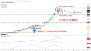 En este caso, el triángulo tiene un lado de proyección – que marca la volatilidad – muy amplio, formado por un antiguo patrón alcista de “tres soldados” y su vela de confirmación posterior que marcó máximos en el BTCUSD.