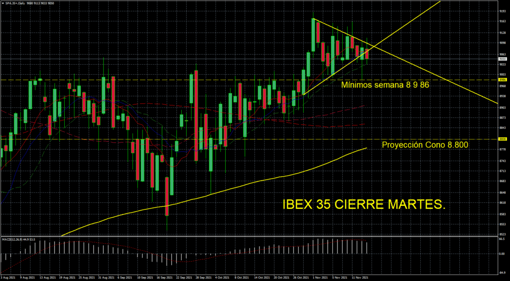 Si se activa bajista en IBEX el cono de volatilidad que llevamos varias sesiones siguiendo, la proyección más optimista ( para los cortos, claro) nos lleva a la zona de 8.800 ptos. La clave para activación de cortos está en el soporte formado por los mínimos de semana en 8 986 ptos y en la activación de la posible envolvente bajista en el sector banca.