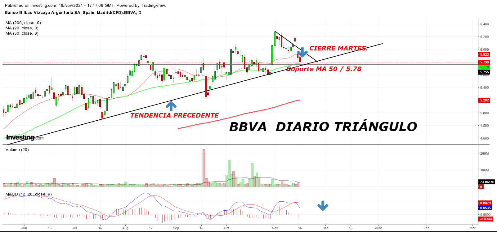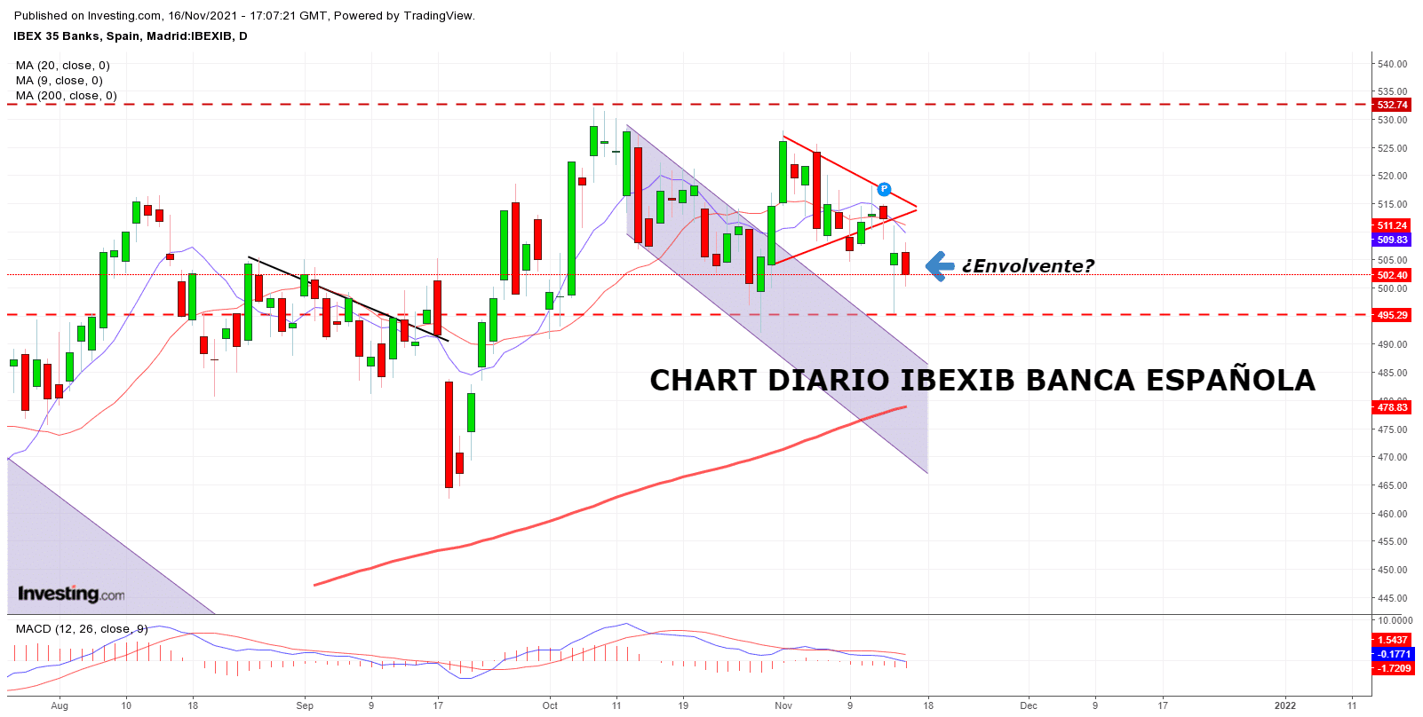 Cierre bajista del IBEX 35 hoy martes con posible envolvente bajista en el Sectorial de Banca . Éste muy revuelto con BBVA ( ver post hoy sobre BBVA) que cerró sobre el soporte de MA 50 Sesiones.