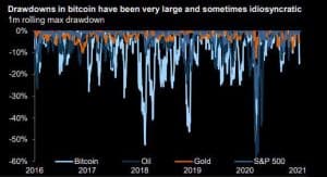 Pero no queda todo en la volatilidad. Si al análisis le añadimos los drawdowns; observamos que, a parte de su magnitud, Goldman señala que por patrón de repetición, algunos son intrínsecos al BTC. Es decir, que se producen, no por circunstancias de mercado ( o no sólo por circunstancias de mercado) si no porque forman parte del activo tal y como está concebido y programado. Siguiente gráfico Drawdowns BTC.