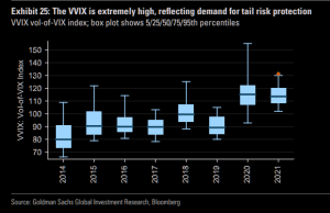 Por otro lado, la volatilidad sigue alcista. Además de que estamos en una estacionalidad que, por estadística, es volátil lo importante aquí es que la volatilidad de la volatilidad – que mide el VVIX – sigue al alza por encima del propio VIX o índice de volatilidad del S&P 500.