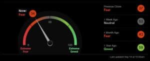 El marcador del miedo y la codicia en el mercado de la CNN – no tan seguido como el Bull & Bear de Bank of America – marca miedo en el NYSE.